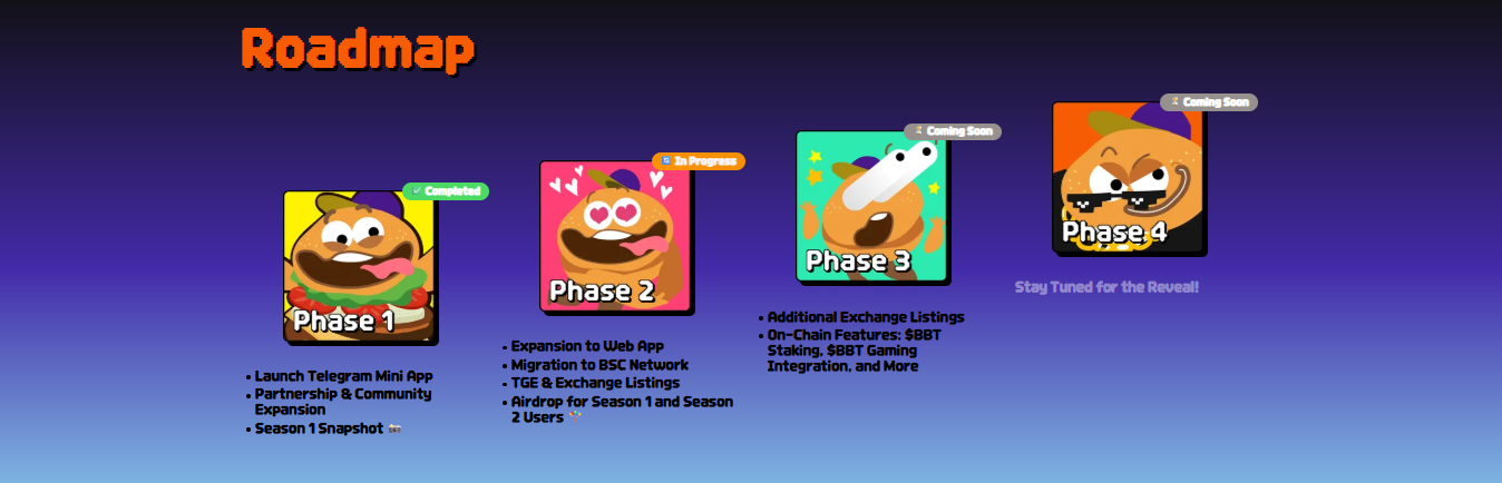 Burger Blast Token (BBT), bu eğlence odaklı ekosistemin merkezinde yer alan ve hem kullanıcı etkileşimini hem de ekonomiyi sürdürülebilir hale getiren token görevi görüyor. Platformdaki her adım – oyun oynama, burger üretimi, geliştirmeler, görevler, etkinlikler, yükseltmeler – BBT ile bir değer döngüsüne dönüştürülmüş durumda.