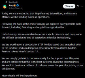 Kapanma kararı yalnızca Step Finance ile sınırlı kalmadı. Solana ekosistemine bağlı NFT analiz platformu SolanaFloor ile kredi ve getiri protokolü Remora Markets de faaliyetlerini sonlandırma kararı aldı. Böylece yaşanan güvenlik ihlali, Solana ekosisteminde birden fazla platformun kapanmasına neden olan zincirleme bir etki yarattı.