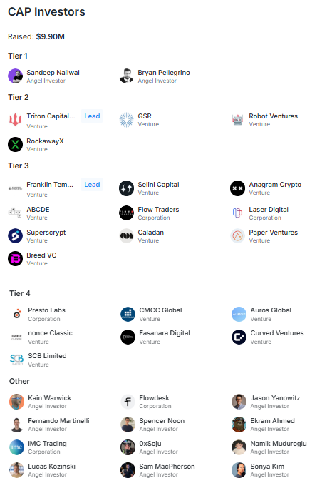 Cap, bugüne kadar toplam 9,90 milyon dolar yatırım toplamıştır. Projeye hem kripto sektörünün önde gelen isimleri hem de geleneksel finans kökenli kurumsal aktörler destek vermektedir.