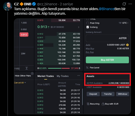 Paylaştığı ekran görüntüsüne göre CZ, bu tokeni piyasa fiyatı olan yaklaşık 0,91 dolar seviyesinden satın aldı. Cüzdanında yaklaşık 2,09 milyon ASTER token bulunduğu görüldü. Bu miktarın güncel piyasa değerinin yaklaşık 2 milyon dolar olduğu tahmin ediliyor.