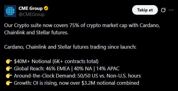 Dünyanın en büyük türev borsalarından biri olan CME Group, kripto para piyasasına yönelik ürün yelpazesini genişletmeye devam ediyor. Geleneksel finans ile dijital varlık piyasaları arasındaki köprü rolünü güçlendiren şirket, üç yeni altcoin için vadeli işlem sözleşmelerini devreye aldığını açıkladı. Bu adım, kurumsal yatırımcıların alternatif kripto varlıklara düzenlenmiş bir platform üzerinden erişimini artırması açısından dikkat çekiyor. Yapılan resmi duyuruya göre Cardano, Chainlink ve Stellar artık CME’nin kripto vadeli işlem ürünleri arasında yer alacak. Böylece CME, yalnızca Bitcoin ve Ethereum gibi büyük piyasa değerine sahip varlıklarla sınırlı kalmayarak, önde gelen altcoin projelerini de türev ürün gamına dahil etmiş oldu. Bu gelişme, altcoin piyasasına yönelik kurumsal ilginin arttığına işaret eden önemli bir adım olarak değerlendiriliyor.
