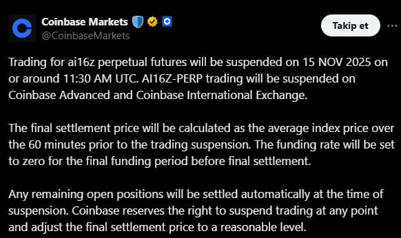 Kripto piyasasında dikkat çeken bir gelişme yaşandı. Coinbase, AI16Z vadeli işlem sözleşmelerinin ticaretini sonlandırma kararı aldı. Şirketin duyurusuna göre AI16Z vadeli işlemlerinin alım satımı 15 Kasım 2025 tarihinde saat 14:30 TSI civarında tamamen askıya alınacak. Bu karar, hem Coinbase Advanced hem de Coinbase International Exchange platformlarında aynı anda uygulanacak.