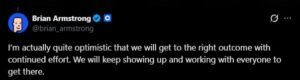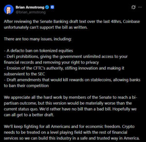 “Sektör için risk oluşturan hükümler mevcut. Müzakereler, daha dengeli bir düzenlemeye kapı açabilir.” – Brian Armstrong, Coinbase CEO