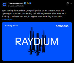 RAY’in Coinbase’de 14 Ocak 2026 tarihinde, saat 12:00 (TSI) itibarıyla spot işlem piyasasında listelenmesi, tokenin likiditesini artırarak piyasa derinliğini güçlendirebilir. Bu sayede yatırımcılar, RAY’i daha kolay alıp satabilecek ve işlemler daha hızlı gerçekleşebilecek. Spot işlem imkanı, özellikle küçük ve orta ölçekli yatırımcıların RAY’a olan ilgisini artırabilir ve tokenin günlük işlem hacminin yükselmesine katkı sağlayabilir.