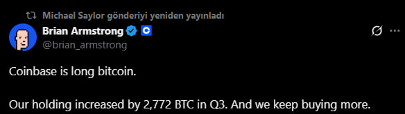 “Coinbase, Bitcoin’e uzun vadeli olarak yatırım yapıyor. Üçüncü çeyrekte Bitcoin varlıklarımız 2.772 adet arttı. Ve alımlara devam ediyoruz.”