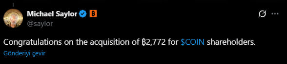 “Coinbase hissedarlarını, 2.772 Bitcoin daha edindikleri için tebrik ederim.”