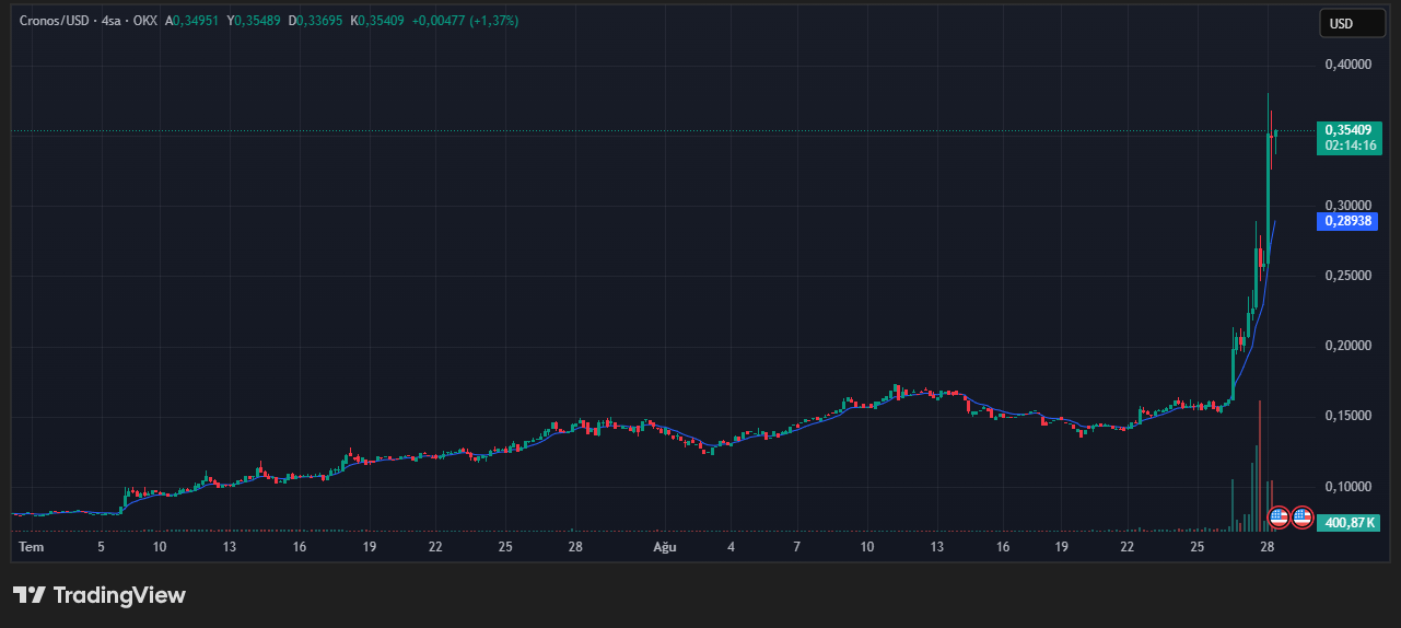 Duyurunun hemen ardından $CRO fiyatı 0,16 dolardan 0,35 dolara kadar yükselerek yatırımcılarına %100’ün üzerinde kazanç sağladı. Bu hızlı yükseliş, piyasalarda büyük ilgi uyandırırken, Cronos’un işlem hacminde de belirgin bir artış yaşandı.