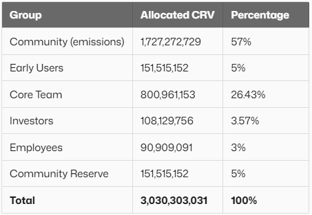 • CRV Öncesi Likidite Sağlayıcıları: %5 (yaklaşık 151.52 milyon CRV).