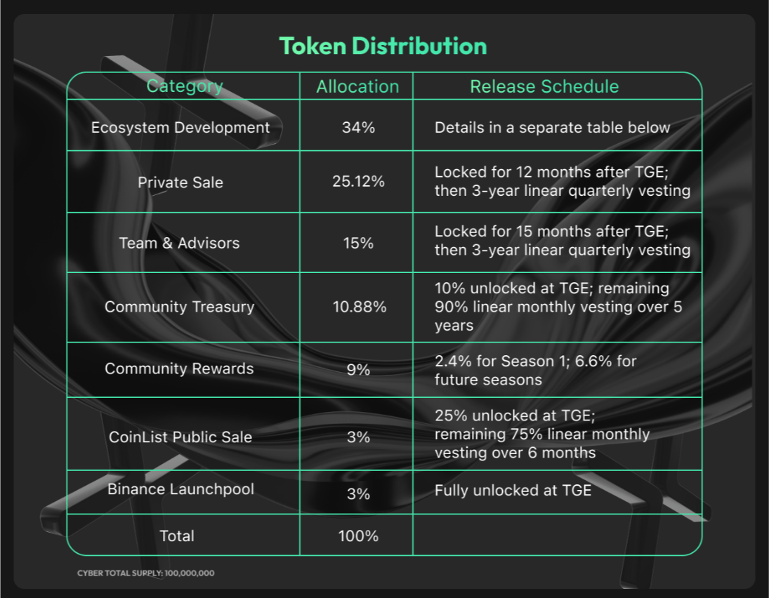 CYBER token, Cyber ekosisteminin temel yönetim ve kullanım token’ıdır. LayerZero’nun OFT (Omnichain Fungible Token) standardını kullanarak birden fazla zincirde kullanılabilir. Toplam 100 milyon adet arzı bulunan CYBER, ekosistemin yönetiminde, staking’de ve ürünlere erişimde kullanılır.