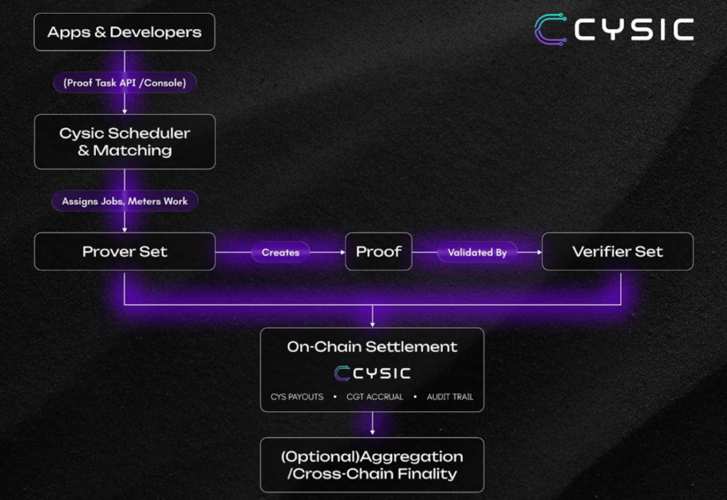 Cysic ekosisteminde üç temel aktör bulunur: hesaplama sağlayıcıları, doğrulayıcılar ve hesaplama talep eden uygulamalar.
