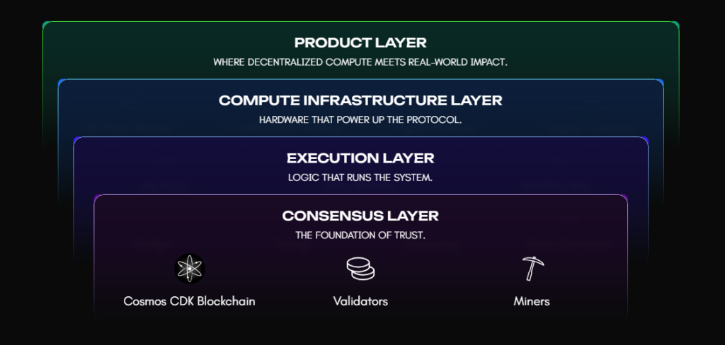 Tüm işleyiş Cosmos CDK ve CometBFT altyapısı ile zincir üzerinde doğrulanır. Proof-of-Compute mantığıyla çalışan sistem, hem güvenli hem de yüksek verimli bir hesaplama akışı sağlar.
