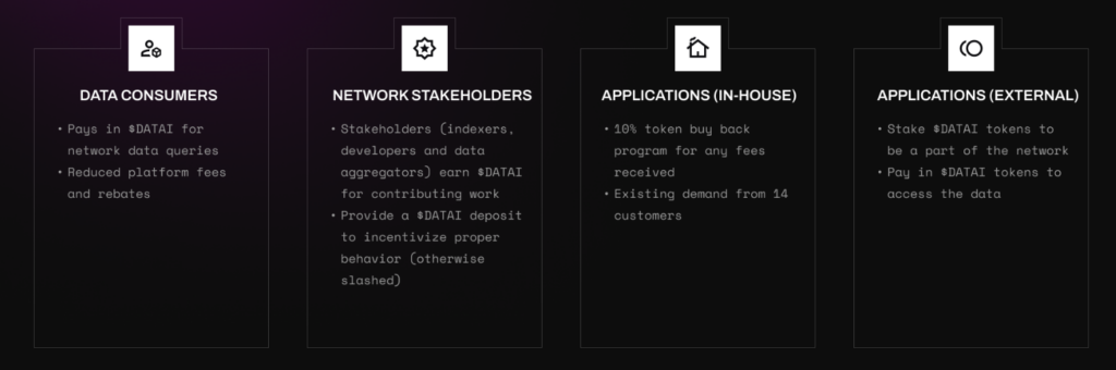 Harici Uygulamalar: Ağa katılmak ve verilere erişmek için $DATAI$ stake edilir ve ödemelerde kullanılır.