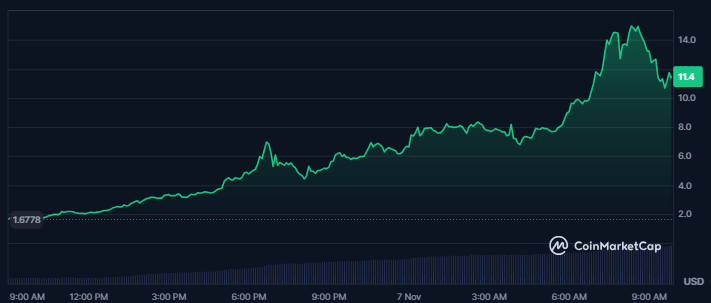 AIA’nın fiyatı 11,48 dolar seviyesine ulaşarak son 24 saatlik periyotta olağanüstü bir yükseliş kaydetti. Bu artış, hem coin’e özgü güçlü katalizörlerin etkisi hem de kısa vadeli spekülatif talebin yoğunlaşmasıyla ortaya çıktı.
