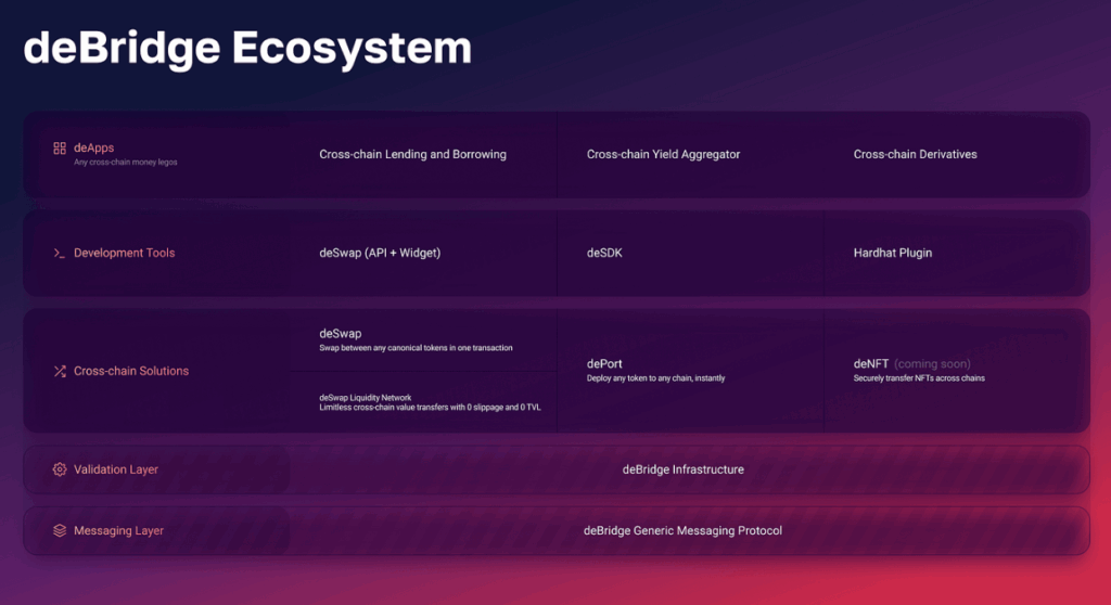 deBridge, DeFi’nin interneti olarak tanımlanan, zincirler arası birlikte çalışabilirlik (interoperability), likidite, mesajlaşma ve köprüleme altyapısı sunan modüler bir protokoldür. Proje, 30’dan fazla blockchain arasında varlık ve veri transferini gerçek zamanlı, güvenli ve sermaye açısından verimli bir biçimde gerçekleştirmeyi hedefler.