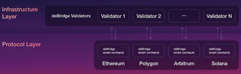 deBridge, zincirler arası işlemleri doğrulayan bağımsız doğrulayıcı (validator) ağı üzerine inşa edilmiştir. Her validator, desteklenen zincirlerdeki akıllı sözleşmeler üzerinden gelen işlemleri imzalar ve güvenli aktarımı sağlar.