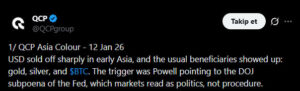Raporda, bu fiyat hareketlerinin arkasında Fed Başkanı Jerome Powell’ın açıklamalarının etkili olduğu vurgulandı. Powell’ın, ABD Adalet Bakanlığı’nın Fed’e yönelik olası tebligat ve cezai suçlamalara ilişkin mesajlarının, piyasa tarafından Fed’in para politikası duruşuna yönelik bir baskı veya misilleme sinyali olarak algılandığı belirtildi. QCP Capital’e göre kısa vadede ekonomik etkiler sınırlı kalabilir. Ancak merkez bankası bağımsızlığının sorgulanması, kurumsal güvenilirlik açısından güçlü bir risk sinyali oluşturuyor. Tarihsel olarak bu tür belirsizliklerin, yatırımcıları altın ve gümüş gibi geleneksel güvenli limanlara yönlendirdiği ifade ediliyor.