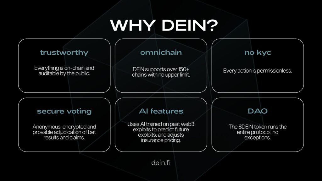 DEIN’in temel amacı, DeFi ekosistemindeki belirsizlikleri azaltmak ve kullanıcıların fonlarını güvence altına almaktır. Platform, üç temel sorunu çözmeyi hedefler: