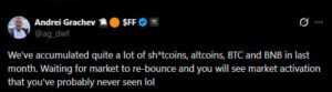 “Geçen ay çok fazla altcoin, Bitcoin ve BNB aldık. Piyasanın yeniden ayağa kalkmasını bekliyoruz. Muhtemelen daha önce hiç görmediğiniz bir piyasa hareketi göreceksiniz.”