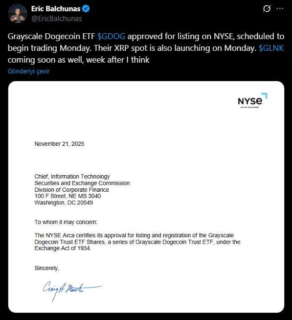 21 Kasım tarihli sertifika mektuplarına göre NYSE Arca, hem XRP hem de Dogecoin ETF’lerinin listeleme koşullarını karşıladığını doğruladı. Bu onay ile birlikte iki fon da ABD yatırımcılarının erişimine açılacak.