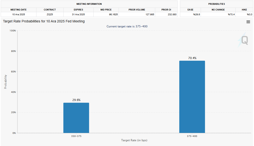 Öte yandan, Ekim ayı istihdam raporunun açıklanmasının Aralık ayı FOMC toplantısı sonrasına ertelenmesi, piyasalarda Aralık ayı faiz indirimi ihtimalini zayıflattı. CME FedWatch Tool verilerine göre yatırımcılar, FED’in 9–10 Aralık toplantısında faiz indirim ihtimalini %49’dan %29.6’ya çekti. Bu nedenle bugün açıklanacak Eylül ayı tarım dışı istihdam verisi kritik önem taşıyor.