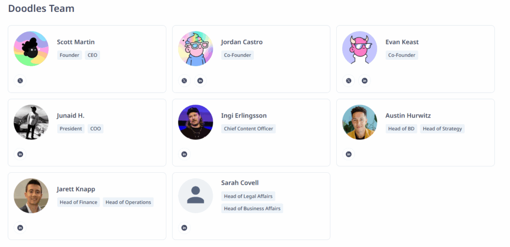 - Scott Martin (Burnt Toast): Projenin baş illüstratörü ve yaratıcı yüzüdür. Aynı zamanda, Ocak 2025 itibarıyla projenin CEO’su olarak görevine geri dönmüştür. Scott’ın sanat stili, Doodles’ın benzersiz kimliğinin temelini oluşturur.