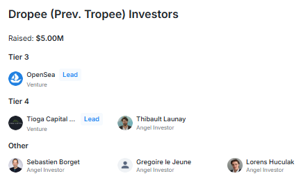 Dropee, toplamda 5 milyon dolar yatırım toplamıştır. Proje, farklı seviyelerde yatırımcıların desteğini almıştır.