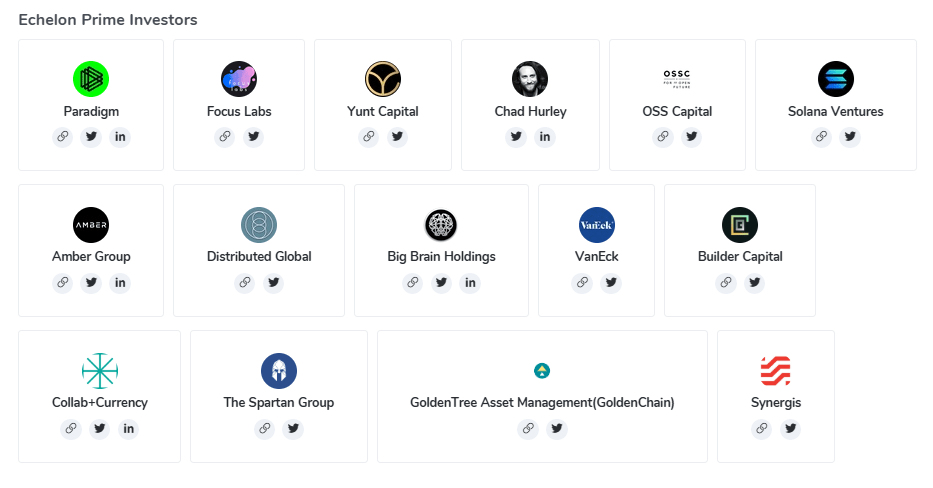 Paradigm, Focus Labs, Yunt Capital, Chad Hurley, OSS Capital, Solana Ventures, Amber Group, Distributed Global, Big Brain Holdings, VanEck, Builder Capital, Collab+Currency, The Spartan Group, GoldenTree Asset Management (GoldenChain), Synergis.