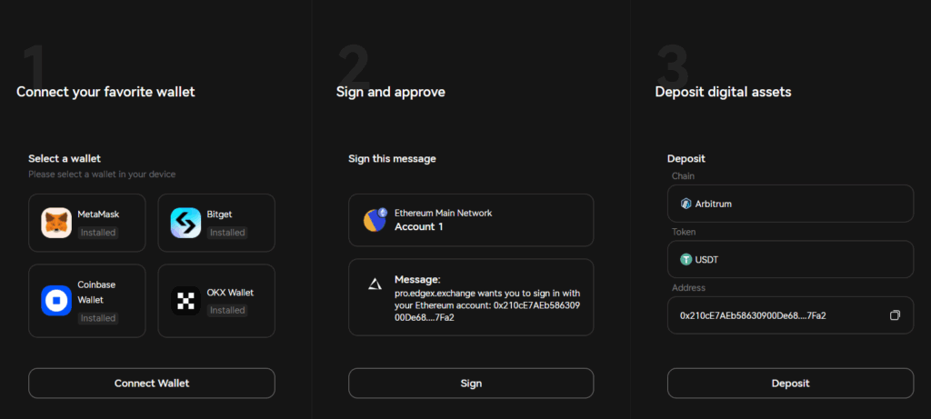 • Varlık ve Zincir Seçimi: Yatırılacak kripto varlık ve hedef zincir belirlenir. edgeX, 70+ blok zinciri ile çapraz zincir desteği sunar.