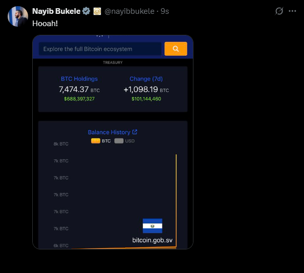 Yaklaşık 100 milyon dolar değerindeki bu yatırım, ülkenin toplam Bitcoin varlığını 7.474 BTC’ye taşıdı. Bu rakam mevcut fiyatlarla yaklaşık 676 milyon dolar seviyesine karşılık geliyor. Böylece El Salvador, piyasalardaki yüksek volatiliteye rağmen Bitcoin stratejisinden geri adım atmadığını bir kez daha göstermiş oldu.