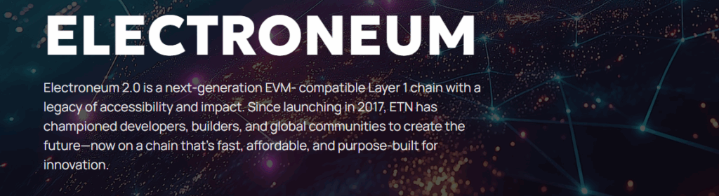 Electroneum (ETN), mobil odaklı bir yaklaşımla küresel finansal katılımı (financial inclusion) hedefleyen, EVM uyumlu (Ethereum Virtual Machine) bir Katman 1 (Layer 1) blok zinciri projesidir. Projenin temel amacı, bankacılık hizmetlerinden yararlanamayan (unbanked) bireylere, bir akıllı telefon aracılığıyla dijital ekonomiye erişim sağlamaktır.