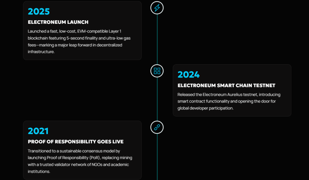 - 2025: Hızlı, düşük maliyetli, EVM uyumlu Katman 1 blok zinciri olan Electroneum (Smart Chain) lansmanı yapıldı.