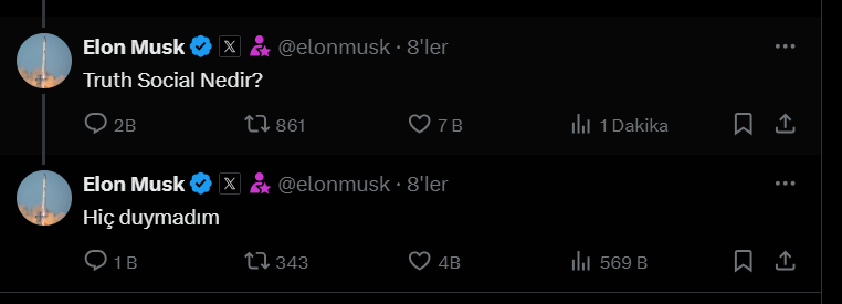Elon Musk Trump’ın yayınladığı yoruma karşılık yukarıdaki cevabı verdi. Öte yandan Musk’ın attığı adımın halk nezdinde karşılığı büyük oldu. X platformunda yaptığı ankette, katılan 1.2 milyon kişinin %65,4’ü yeni bir partiye ihtiyaç olduğunu belirtti. Bu oran, Musk için açık bir yeşil ışık oldu. Ayrıca bu süreçte, Trump ile arasındaki fikir ayrılıkları belirginleşti. Musk daha önce Trump yönetiminde yer aldığı DOGE (Department of Government Efficiency) projesinden geçen ay ayrıldığını açıklamıştı.