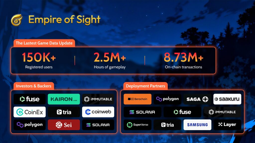 Empire of Sight, 2D görselli bir MMORPG oyunudur ve oyunculara açık dünyada PVP yapma, görev tamamlama, raid’lere katılma ve boss savaşlarına girme imkânı sunar. Oyun, klasik MMORPG deneyimini Web3 altyapısı ile birleştirerek oyuncuların karakter ve eşyalarını NFT olarak sahiplenmelerine olanak tanır. Bu varlıklar oyun içinde kullanılabilir, takas edilebilir veya ikinci el piyasalarda satılabilir.