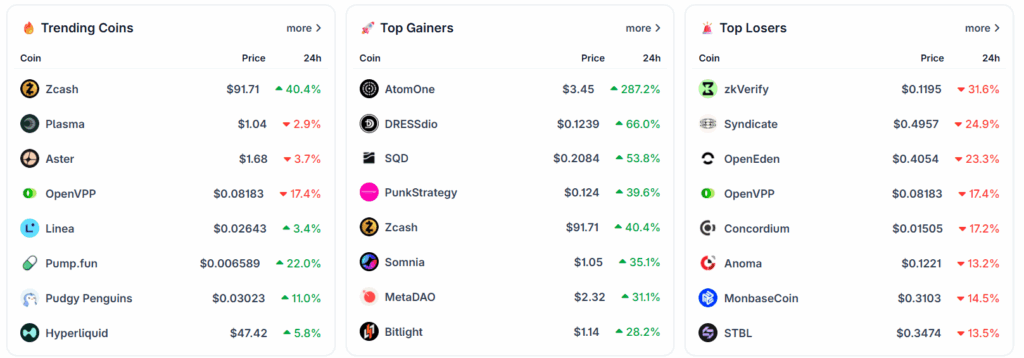 CoinGecko verilerine göre bugün en çok trend olan kripto paralar Zcash (ZEC), Plasma (XPL) ve Aster (ASTER) oldu. Son üç saatte yatırımcıların en fazla aradığı coinler arasında bu üç isim öne çıktı. Kripto para piyasasında fiyat hareketliliği dikkat çekerken, yükselen coinler ve düşen projeler yatırımcıların radarına girdi.