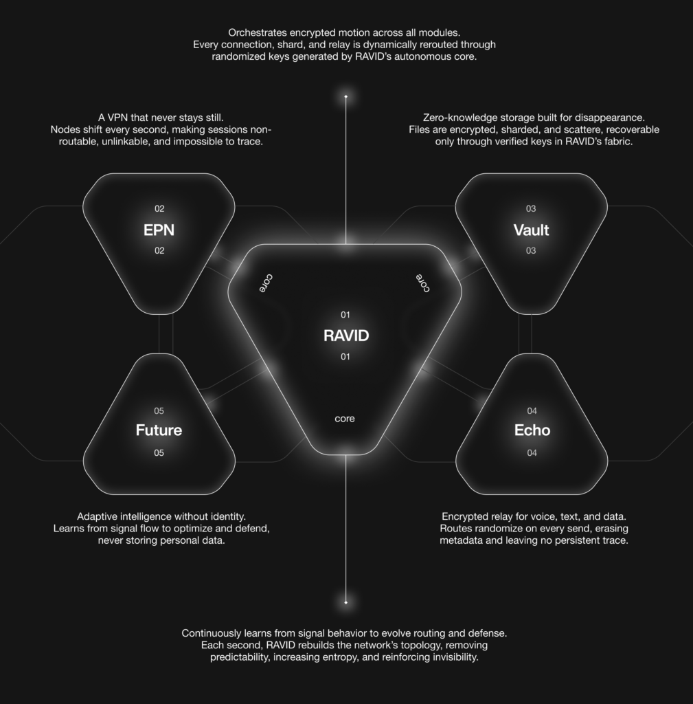 RAVID (Merkezi Çekirdek): Modüller arası şifreli trafiği yönetir; rastgele anahtarlarla bağlantıları dinamik yönlendirir ve topolojiyi sürekli yeniden inşa eder.