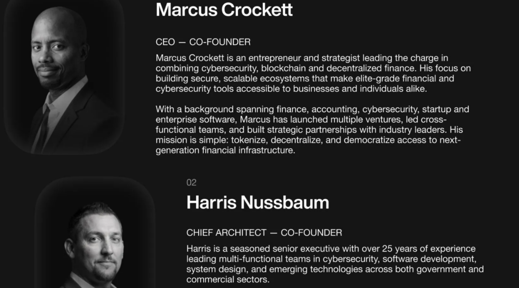 - Marcus Crockett – CEO ve Kurucu Ortak; ABD Savunma Bakanlığı, kritik altyapılar ve finans kurumları güvenliği tecrübesi.