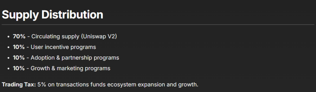 İşlem vergisi %5 olup ekosistem büyümesi ve sürdürülebilirlik için kullanılır.