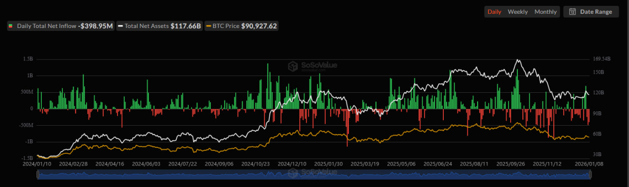 Günün en dikkat çekici verilerinden biri, spot Bitcoin ETF’lerinde kaydedilen 398,95 milyon dolarlık net çıkış oldu. Bu rakam, son dönemin en yüksek günlük çıkışları arasında yer alıyor. Bitcoin fiyatında görülen kısa vadeli dalgalanmalar ve yatırımcıların risk azaltma yönünde attığı adımlar, bu çıkışın başlıca nedenleri olarak öne çıkıyor. Özellikle kurumsal yatırımcıların volatilitenin arttığı dönemlerde pozisyonlarını küçültmesi, Bitcoin ETF’lerinden yaşanan fon çıkışını hızlandırmış görünüyor.