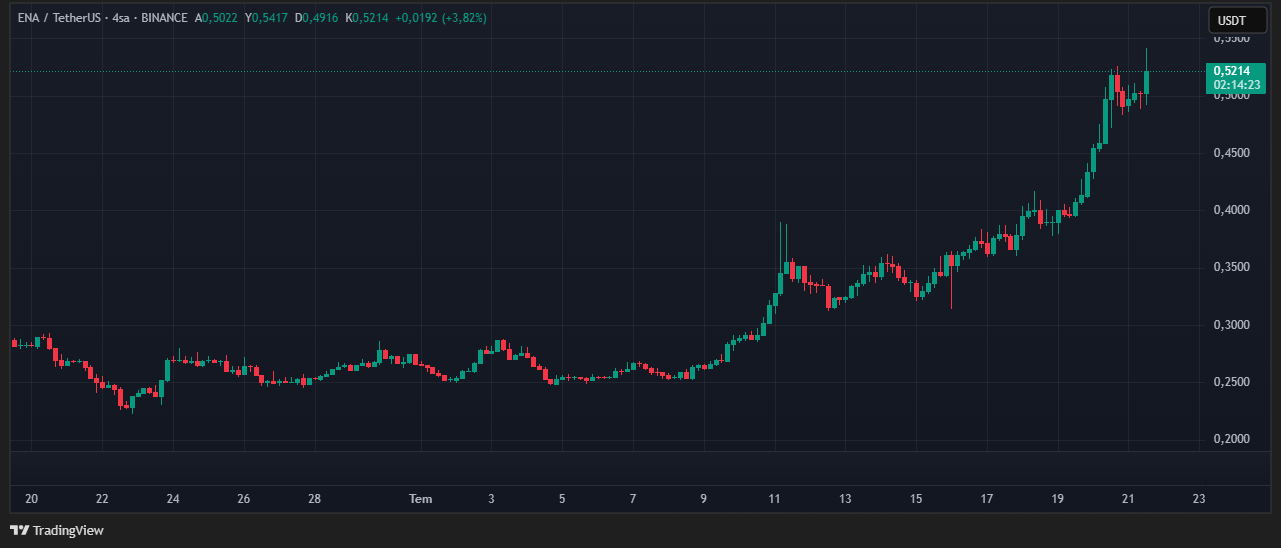 Bu haberin etkisiyle birlikte, ENA fiyatı 0,53 dolar seviyesine yükselirken, günlük bazda %7,43’lük bir artış kaydedildi. Piyasadaki bu ani hareketlilik, yatırımcıların ENA’ya olan güvenini ve ilgisini bir kez daha ortaya koydu.