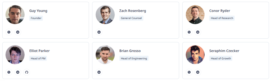 Ethena ekibi: Guy Young (Kurucu), Zach Rosenberg (Genel Danışman), Conor Ryder (Araştırma Başkanı), Elliot Parker (PM Başkanı), Brian Grosso (Mühendislik Başkanı), Seraphim Czecker (Büyüme Başkanı).