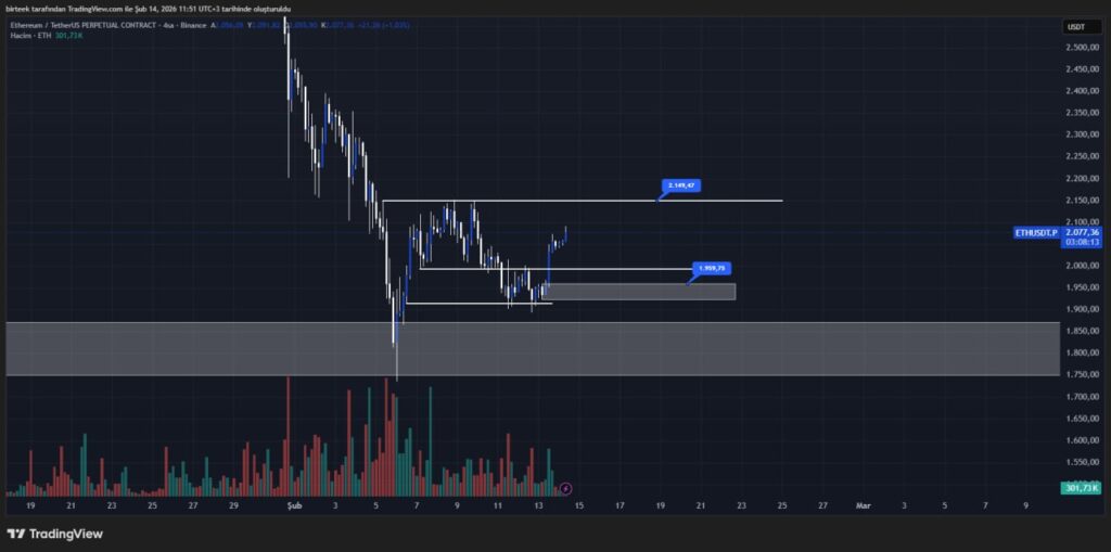 Kısa vadede Ethereum yeni bir dip yapmadan likidite alımı gerçekleştirdi ve yukarı yönlü bir kırılım üretti. Mevcut yapıda ilk hedef 2.149 dolar seviyesi olarak öne çıkıyor.