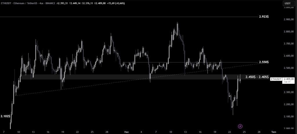 Ethereum fiyatı 2.438 dolara ulaşarak 2.500 dolar seviyesini test etmeye hazırlanıyor. ETH şu anda 2.450 – 2.405 dolar direnç bandında işlem görüyor. Bu bölgenin aşılması, fiyatın 2.550 dolar seviyelerine doğru ivmelenmesini sağlayabilir. Yukarı yönlü bu kırılma, teknik göstergelerin ve likidite yapısının desteklediği güçlü bir yükselişin önünü açabilir.