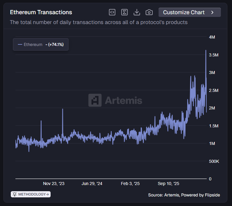 Bu rakam, 2025’in son çeyreğinde kaydedilen 145 milyon işlem seviyesine göre %43’lük güçlü bir artışa işaret ediyor. Ethereum ağı, 2023 yılında yaklaşık 90 milyon işlemle dip seviyeyi gördükten sonra 2024 boyunca kademeli bir toparlanma sürecine girmişti.