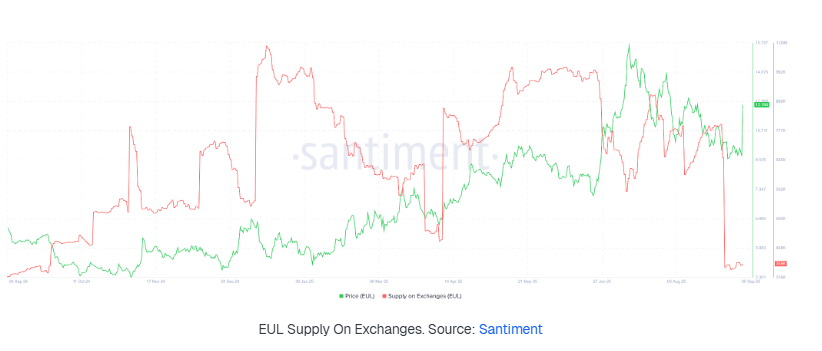 Euler (EUL) rezervleri, Ağustos sonundaki 795.000 EUL seviyesinden Eylül’de 358.000 EUL’e geriledi. Yani 437.000 EUL borsalardan çekildi. Bu hareket, Bithumb listelenmesinden bir hafta önce gerçekleşti ve fiyat %30 artış gösterdi.