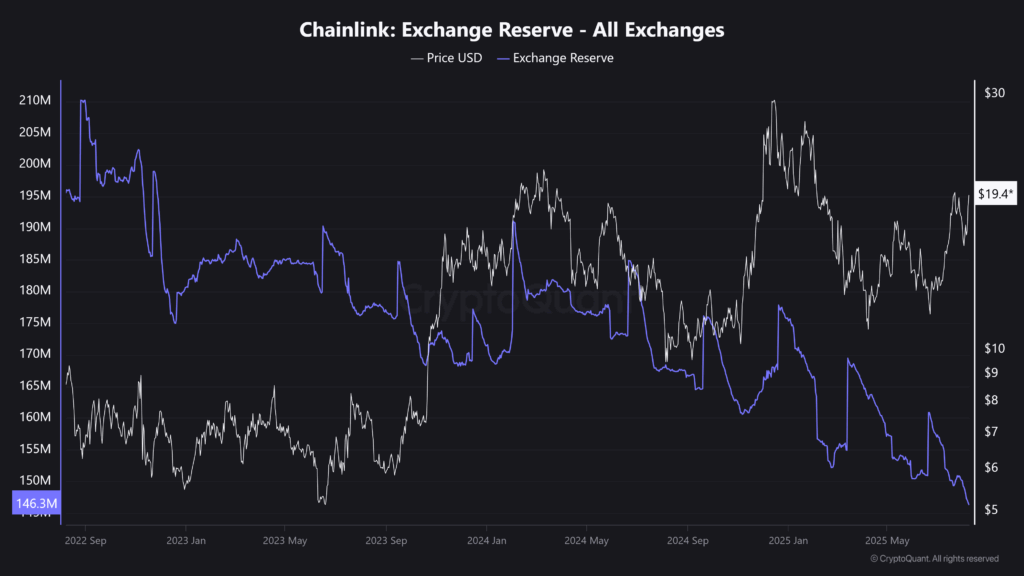 Chainlink’in borsa rezervleri yıl başından bu yana %16 azalarak 146,2 milyon LINK seviyesine geriledi. Ancak LINK fiyatı, 15,5 dolardan 19 doların üzerine çıkarak %15 değer kazandı. Santiment verileri zincir içi cüzdanlarda büyük LINK birikiminin yeniden başladığını ortaya koydu. Ağustos başında, 100 bin ile 1 milyon dolar arasında LINK tutan cüzdanlarda %4,2 artış kaydedildi. Ayrıca, Chainlink’in protokol gelirlerini LINK alımlarına dönüştüren Chainlink Rezervi uygulaması Ağustos’ta devreye girdi. Bu sayede, uzun vadeli birikim eğilimi güçlendi.