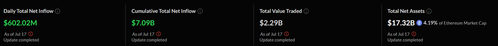 ABD’de spot kripto ETF’lerinin 18 aylık tarihinde bir ilk yaşandı. Ethereum ETF’leri, günlük net girişlerde Bitcoin ETF’lerini geride bıraktı. Perşembe günü açıklanan verilere göre, dokuz spot Ethereum ETF’sine toplam 602 milyon dolarlık giriş gerçekleşti. Aynı gün Bitcoin ETF’leri ise 522,6 milyon dolarlık sermaye çekti. Bu önemli veri, on-chain analiz platformu SoSoValue tarafından derlendi.