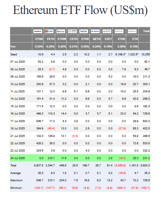 Fidelity’nin Ethereum Fonu (FETH) ise 25 Temmuz Perşembe günü en iyi performans gününü yaşadı. Fon, yalnızca o gün 210 milyon dolarlık net giriş aldı. Bu rakam, 10 Aralık 2024’te kaydedilen önceki rekorun %4 üzerine çıktı.