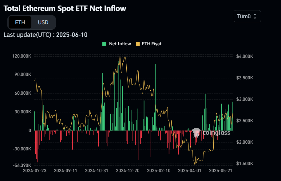 10 Haziran’da 125 milyon dolarlık net giriş kaydedildi. Günün en yüksek katkısını BlackRock’un ETHA ETF’i yaptı: 80,59 milyon dolar. Yani bu alımlar, Ethereum’un ETF cephesinde istikrarlı talep gördüğünü net biçimde ortaya koyuyor. ETF yatırımları şu an Ether’ın fiyatına sınırlı etki etse de zincir üstü veriler, fiyat üzerinde potansiyel baskı yaratabileceğini işaret ediyor. Çünkü bu yatırımların büyük bölümü doğrudan spot alımı kapsıyor. Ayrıca, bu girişlerin hiçbirinde şimdiye kadar net çıkış yaşanmadı.