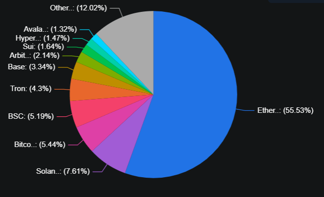 Ethereum’un temel katmanında 66,6 milyar dolarlık toplam kilitli değer (TVL) bulunuyor. Bu, rakip ağların oldukça üzerinde. Ethereum, TVL bazında %61’lik piyasa hakimiyeti taşıyor. En yakın rakiplerinin toplam payı ise sadece %14.