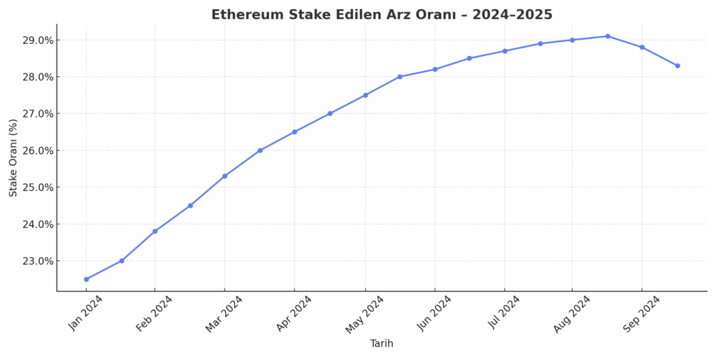 ETF etkisiyle birlikte Ethereum’un zincir üstü göstergeleri arz sıkışmasına işaret ediyor. Mevcut borsa cüzdanlarında tutulan Ether miktarı 16,33 milyon ETH’ye düştü. Bu, tarihin en düşük seviyesi. Bununla birlikte toplam ETH arzının %28,3’ü şu anda stake edilmiş durumda. Bu veriler, dolaşımdaki arzın büyük bölümünün satılabilir durumda olmadığını ortaya koyuyor.